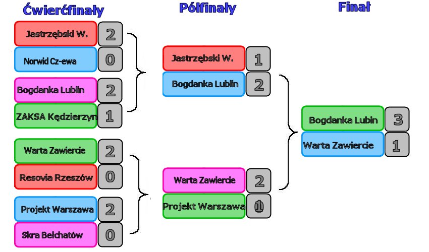 Walka o medale rozegrała się pomiędzy obrońcą tytułu, zespołem Jastrzębskiego Węgla, wicemistrzem Polski Aluronem CMC Wartą Zawiercie, Projektem Warszawa i Bogdanką LUK Lublin. W półfinałach Bogdanka pokonała mistrza Polski, a Warta Zawiercie wygrała z PGE Projektem Warszawa i o mistrzostwie miał zadecydować finał do trzech wygranych pomiędzy Bogdanką a Wartą, z którego zwycięsko wyszedł rywal ZAKSY w ćwierćfinałach, zdobywając pierwszy w historii klubu tytuł mistrzowski. W pojedynku o trzecie miejsce pomiędzy Jastrzębskim Węglem a PGE Projektem Warszawa lepsi okazali się warszawianie, którzy po raz drugi z rzędu musieli zadowolić się brązowymi medalami. Największym przegranym został więc ubiegłoroczny mistrz Polski, zespół Jastrzębskiego Węgla, który nie tylko że nie obronił tytułu, ale nawet nie stanął na podium.